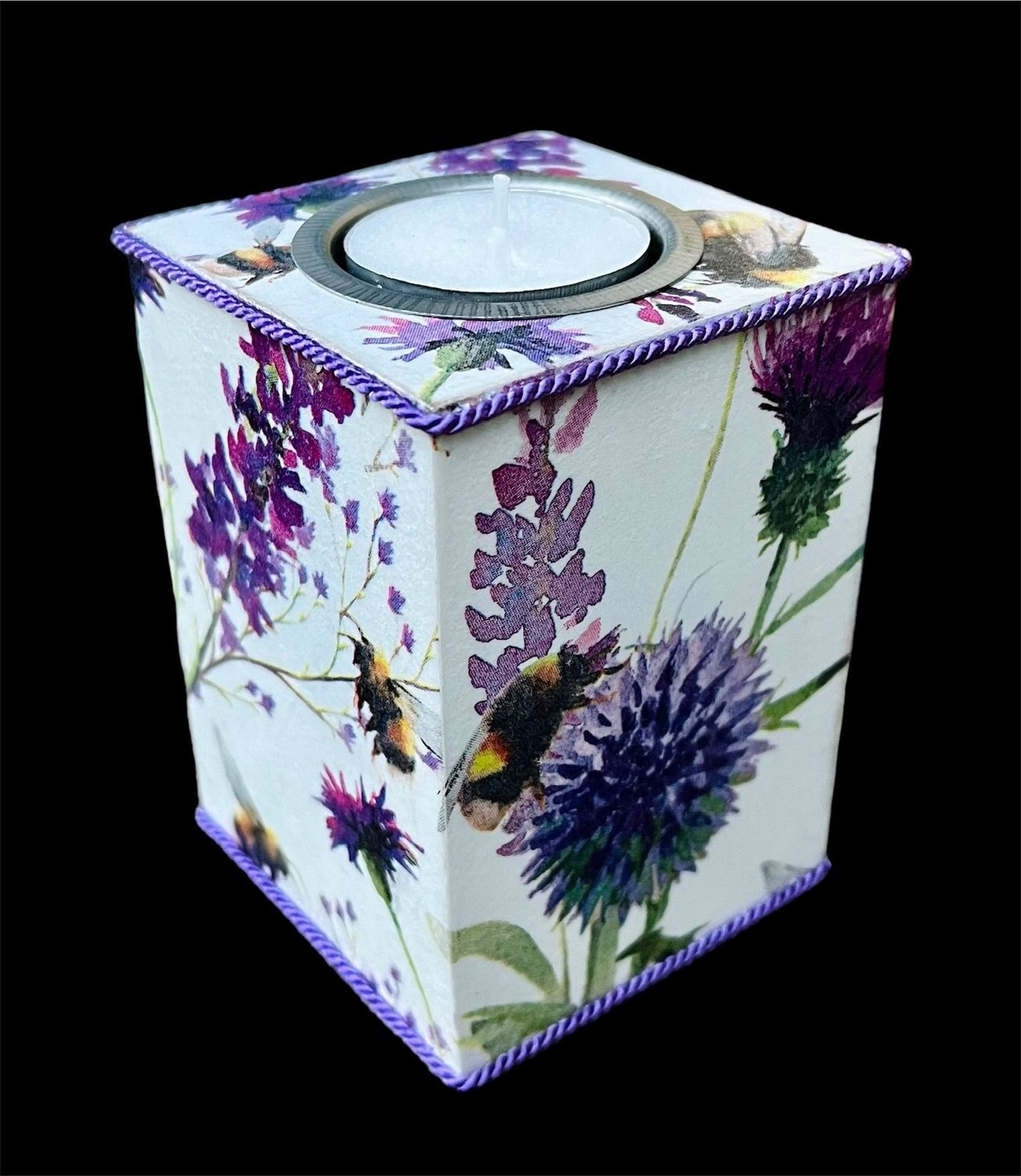 Single tealight holder decoupaged in a bees in lavender and thistles theme.